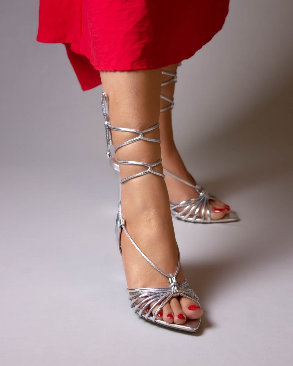 Sandália prata metalizada com tiras finas entrelaçadas na parte frontal, trazendo um visual moderno e elegante. O modelo possui amarração no tornozelo que garante ajuste seguro e salto de 7cm, proporcionando equilíbrio entre estilo e conforto. Uma escolha versátil para compor looks sofisticados em diferentes ocasiões.