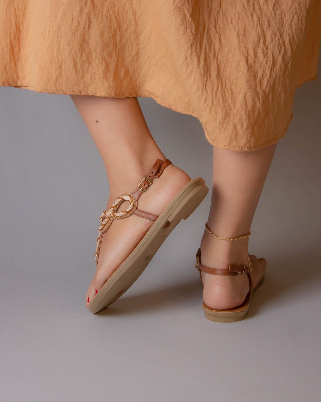 Rasteira marrom em napa, com tiras trabalhadas em detalhe de nó frontal que valoriza o design. O modelo possui fechamento com fivela no tornozelo, garantindo ajuste seguro. Leve e prática, é uma opção versátil para o dia a dia, unindo conforto e estilo em um só calçado.