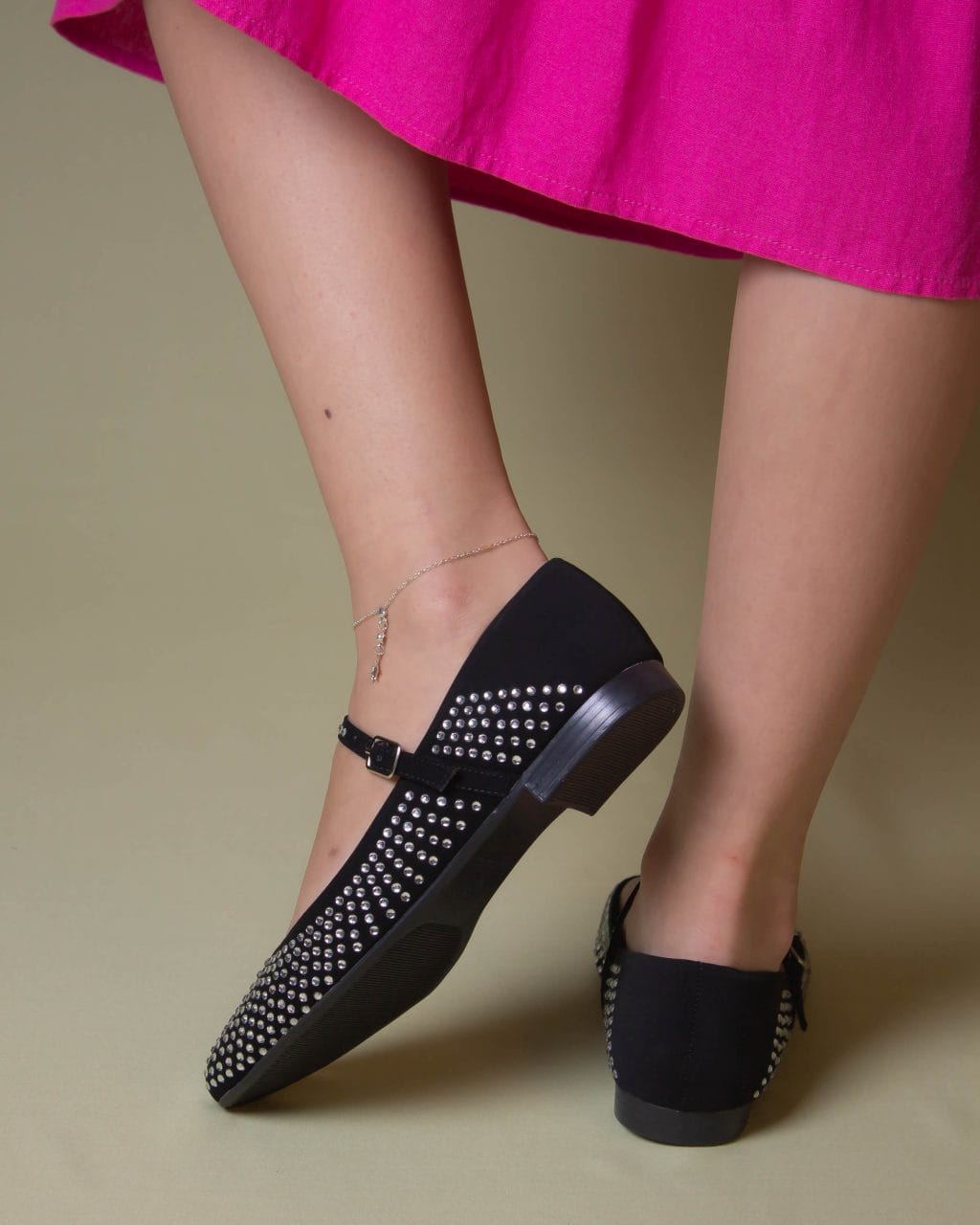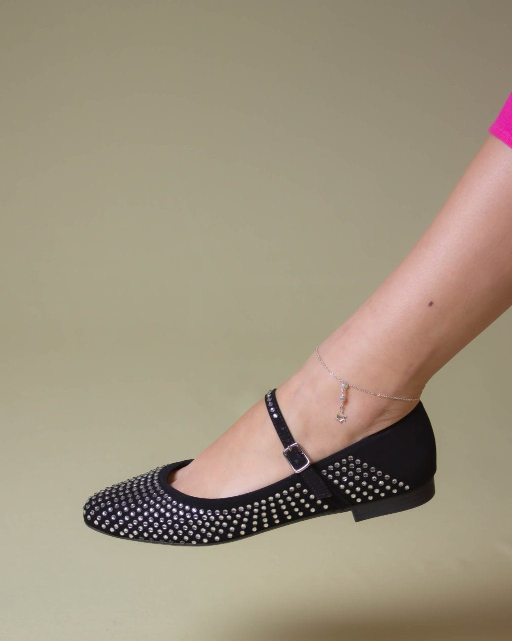 Sapatilha preta em nobuck com salto baixo de 1cm e aplicação de pedrarias em toda a superfície, criando um visual elegante e moderno. Possui fechamento em tira com fivela, garantindo praticidade e ajuste seguro. Um calçado confortável e sofisticado, ideal para diferentes estilos e ocasiões.
