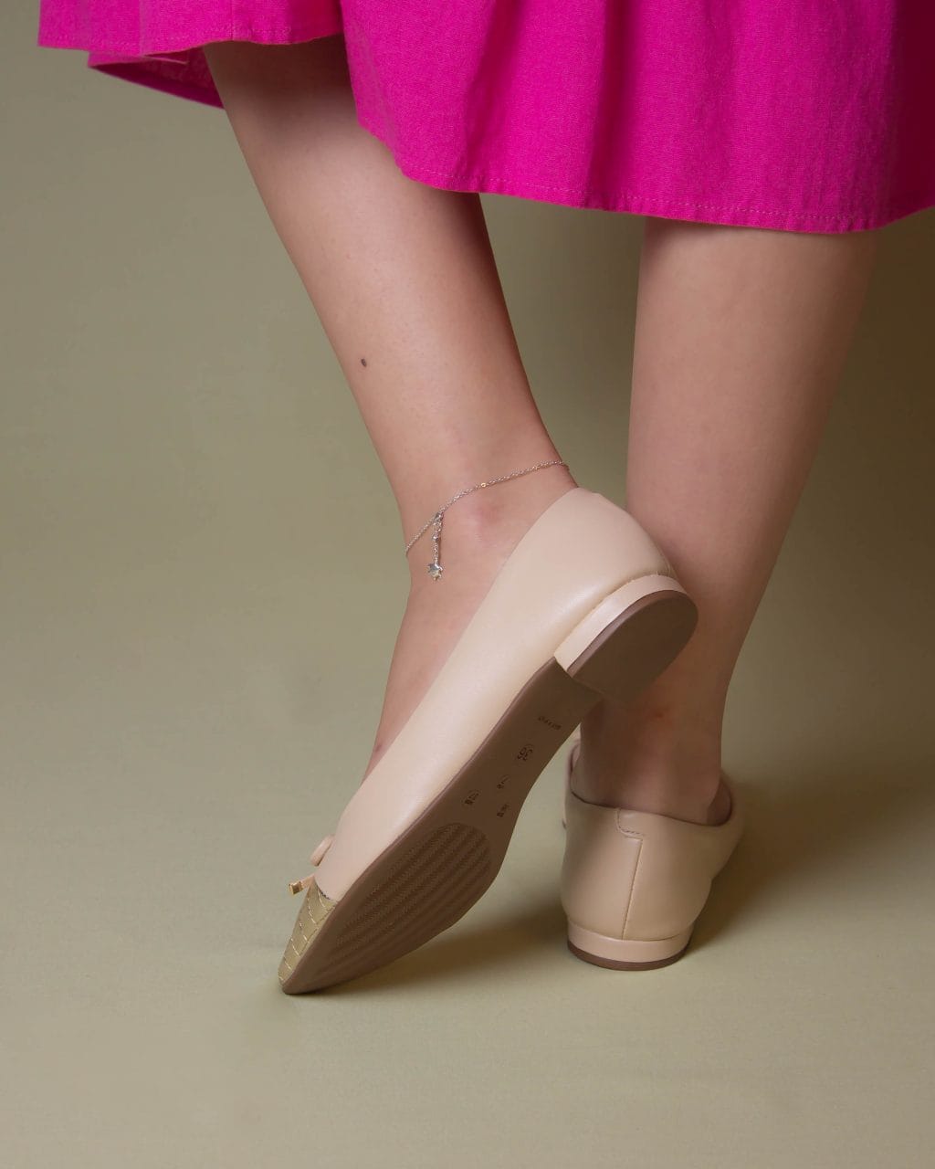 Sapatilha off-white em napa, com salto baixo de 1 cm, que combina conforto e elegância em um design versátil. O modelo apresenta bico fino em tom dourado com efeito matelassê, além de laço delicado com ponteiras metálicas. Um calçado prático e sofisticado, ideal para complementar diferentes estilos de produção.