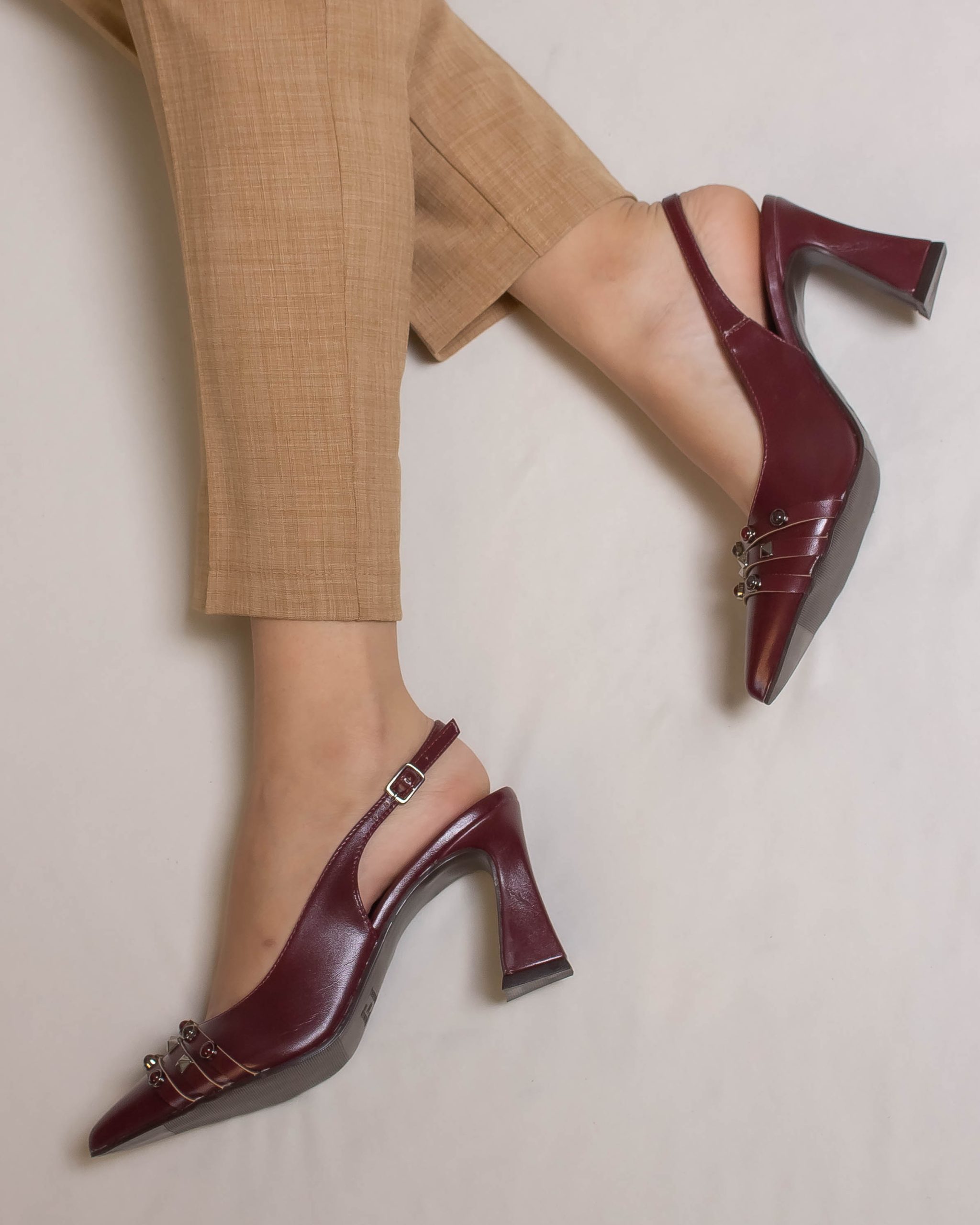 Scarpin slingback em napa marsala, com bico fino e tiras frontais adornadas por tachas metálicas em diferentes formatos. O salto alto de 9cm possui base levemente alargada, proporcionando estabilidade e imponência. Um modelo que combina sofisticação clássica com detalhes modernos, ideal para quem valoriza elegância e estilo em uma única peça.
