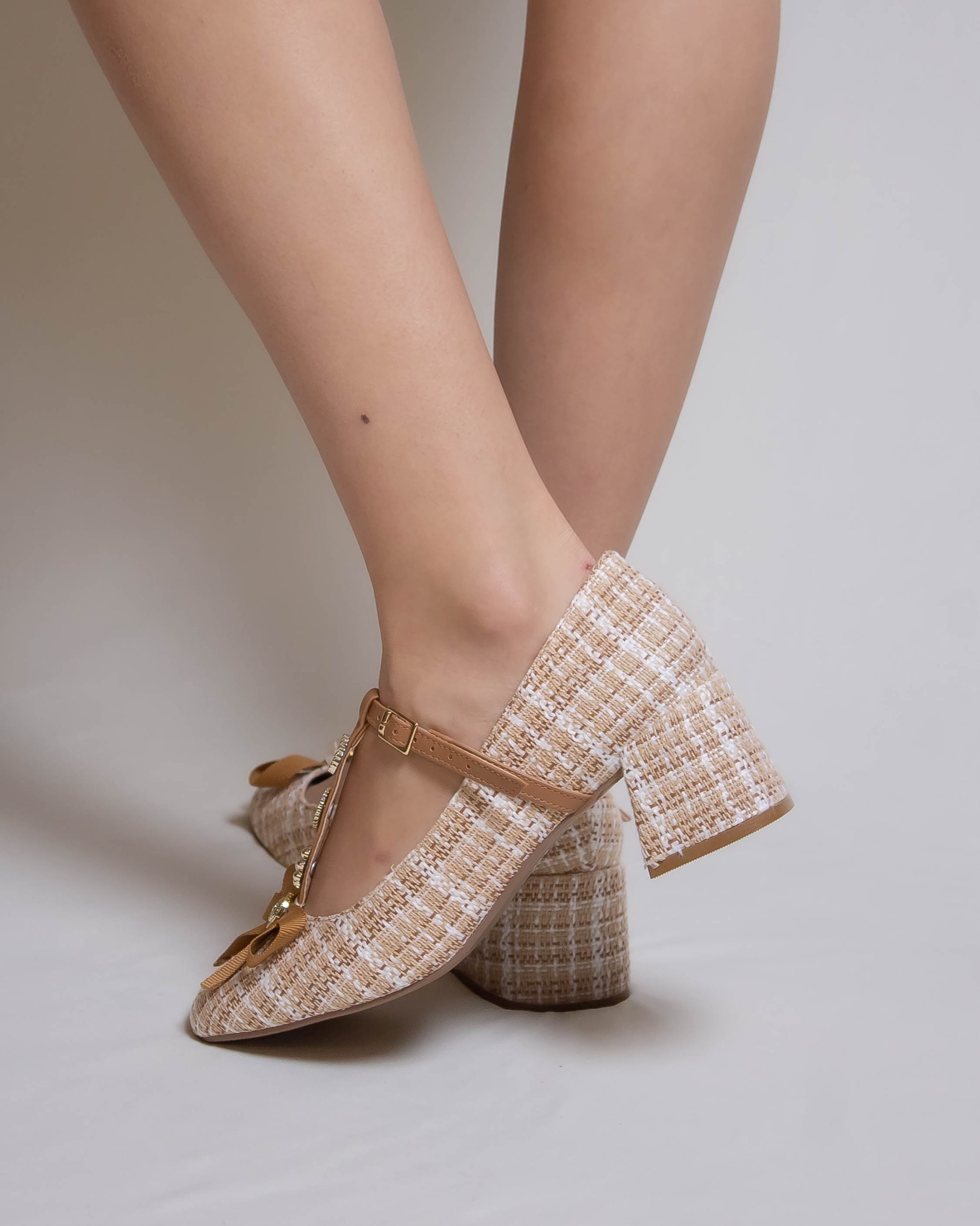 Scarpin em tecido bege com estampa xadrez suave, que transmite charme e sofisticação. Possui salto médio de 6cm em formato bloco, proporcionando conforto e elegância. O modelo conta ainda com laço delicado na parte frontal e tira ajustável com fivela, garantindo firmeza ao caminhar e um toque diferenciado no visual.
