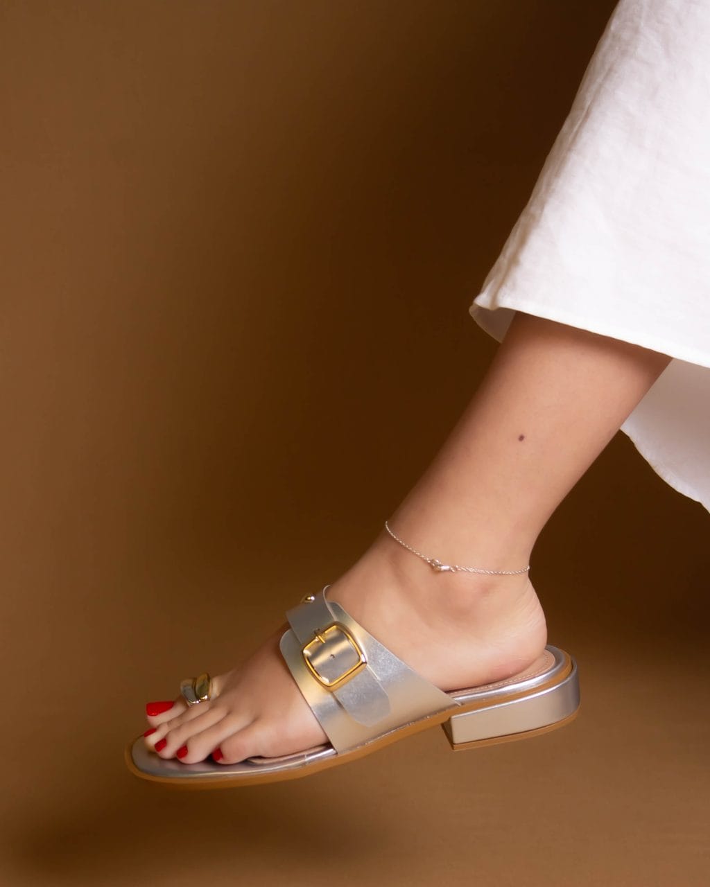 Tamanco prata metalizado com salto baixo de 2cm, detalhe de fivela frontal e aplicações metálicas decorativas. O design moderno valoriza os pés e oferece conforto para o dia a dia. O brilho prateado traz um toque sofisticado, ideal para compor produções elegantes e cheias de estilo.