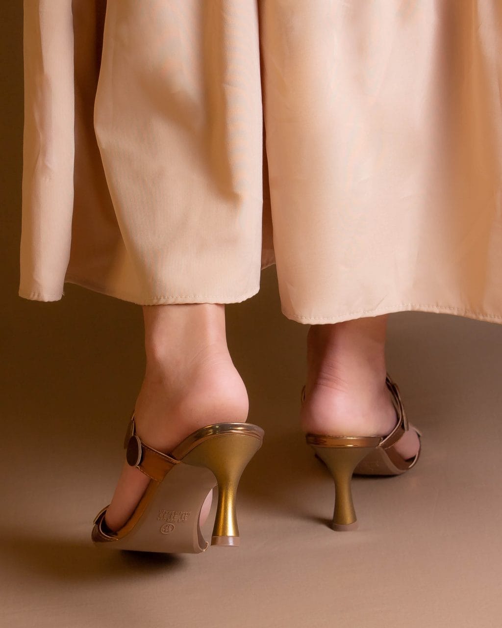 Tamanco dourado em verniz com salto fino de 9cm e tiras adornadas por grandes aplicações metálicas circulares. O design moderno e sofisticado destaca o brilho do acabamento, proporcionando elegância e impacto visual. Um modelo ideal para composições refinadas e ocasiões especiais.