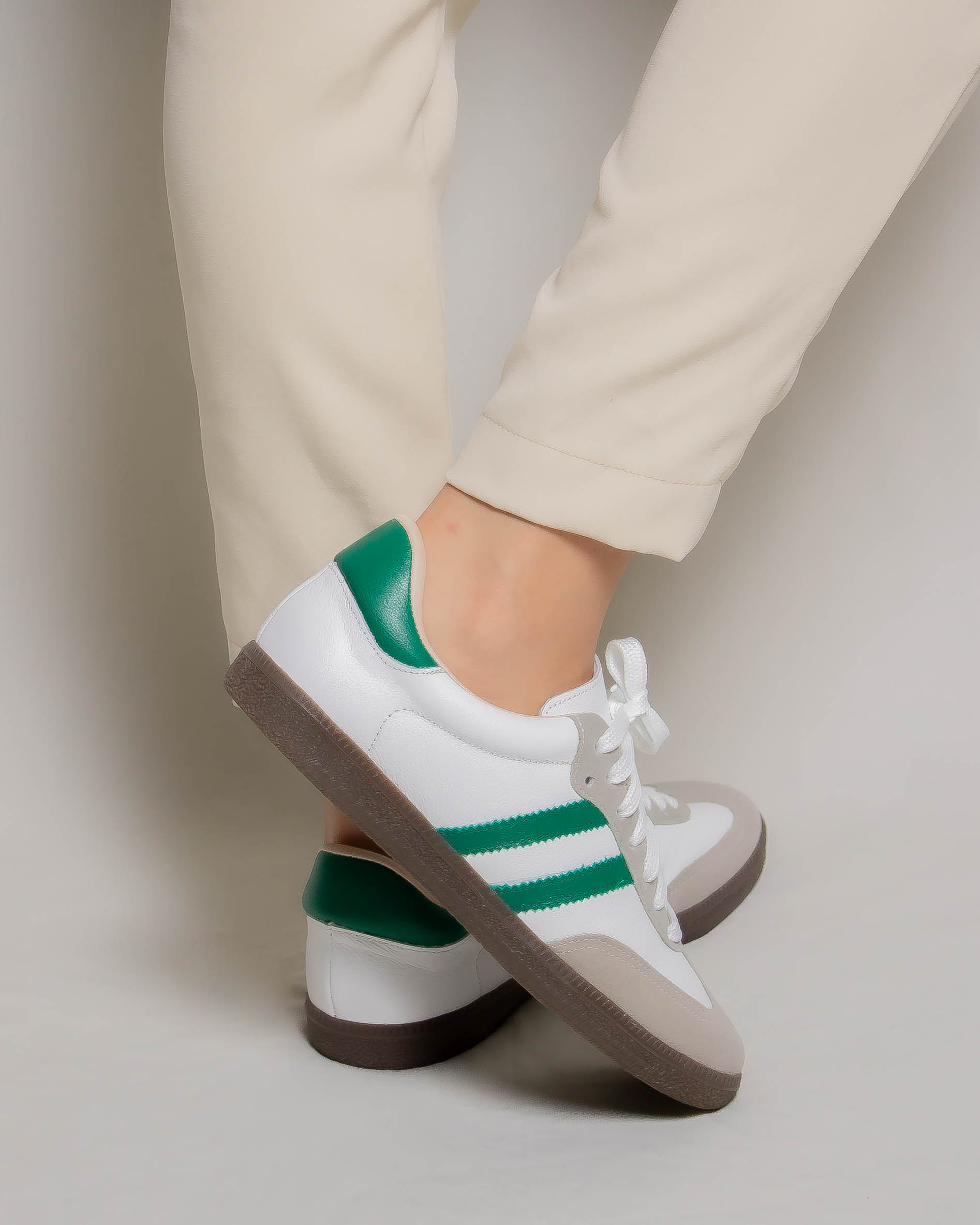 Este tênis é a escolha ideal para quem busca estilo atemporal, conforto e versatilidade no dia a dia. Com um design clássico que nunca sai de moda, ele combina facilmente com diferentes looks — do casual ao urbano. As listras verdes trazem um toque moderno e elegante, enquanto o solado emborrachado garante segurança e estabilidade a cada passo. É perfeito para quem quer um calçado confortável, bonito e funcional para usar em diversas ocasiões.